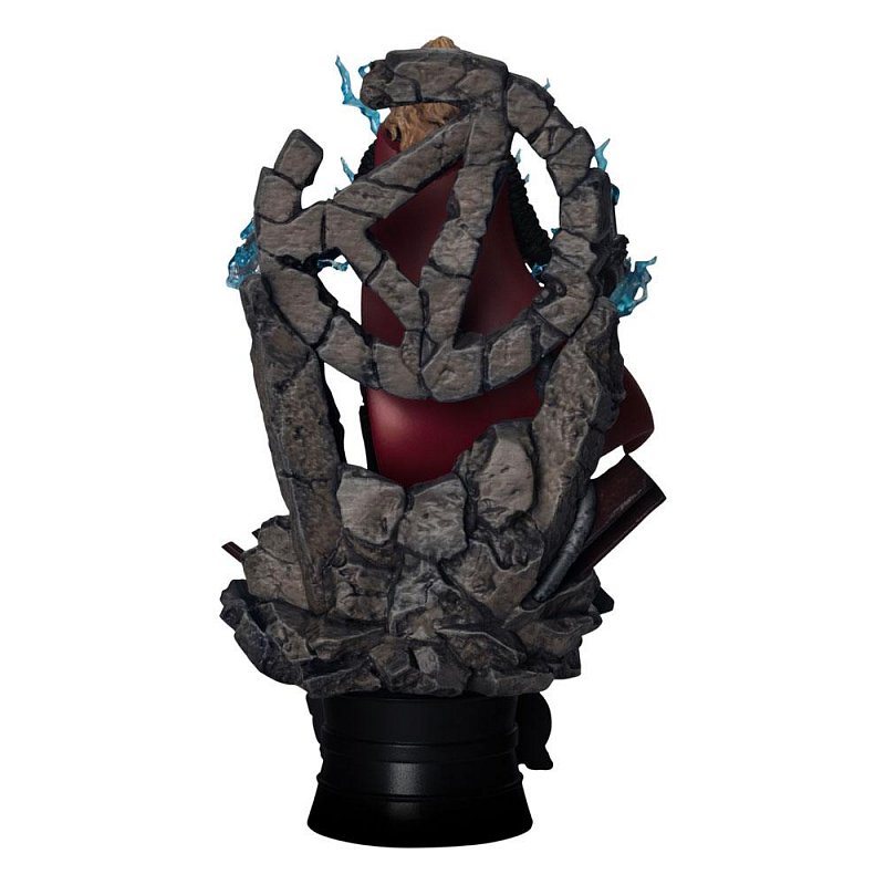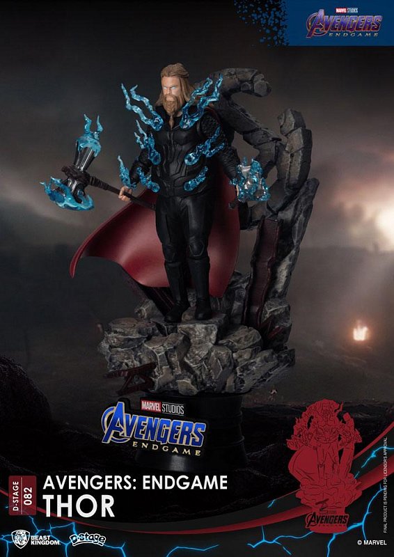 The D-Stage-082 sees Thor ready to charge Thanos and his minions with the might of both the Mjolnir hammer and his Stormbreaker axe in both hands. Lightning effects engulf his body as he prepares for the final showdown! Also set against the backdrop of a fallen Avengers logo the stakes had never been this high. The D-Stage Thor is a perfect diorama for fans of the mightiest god to grace our screens!