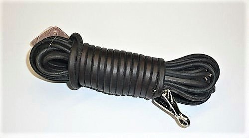 Barvářská šňůřa z kulaté hnědé kůže s karabinou 8 m