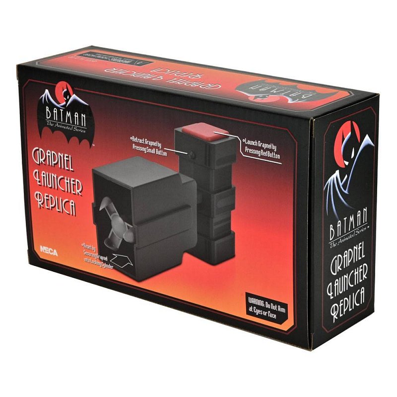 Zur animierten TV-Serie \"Batman\" kommt diese offiziell lizenzierte und originalgetreute Nachbildung von Batmans Grapnel Launcher. Er ist ca. 18 cm lang und wird in einem bedruckten Karton geliefert. Per Knopfdruck rollt sich das Seil nach einem Abschuss wieder automatisch auf.