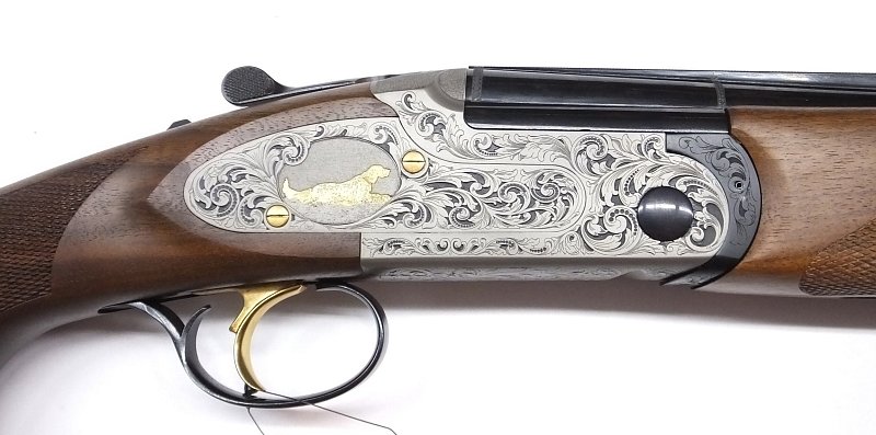 Lučík v odstínu puškařské černě, zdoben jemnou listovou gravurou a loveckým motivem