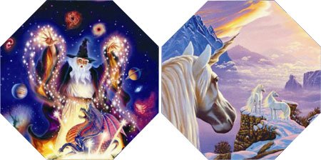 Balení obsahuje dvoje osmiúhleníkové puzzle, každé o velikosti 700 dílků, s fantasy motivem Čaroděj a Jednorožeč