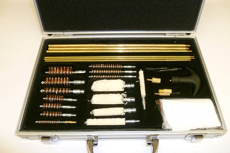 Čistící sada v alu kufru obsahuje čištění od ráže .17 do brokové 12. Obsahuje mosazné a bavlněné kartáčky (lacetky) a skládací tyč.