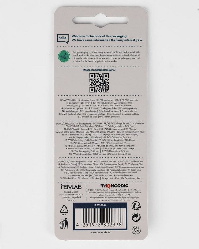High-quality keychain from the Darksiders video game franchise by THQ Nordic. The keychain measures 8cm in length and features War´s powerful sword and faithful companion from the first Darksiders title Chaoseater, precisely and detailed produced with brushed metal. Make it your mission to maintain the balance between Heaven and Hell with the four Apocalyptic Horsemen. Sustainably produced, the keychain is made from 100% recycled, nickel-free metal, making it suitable for allergy sufferers. Produced from 100% recycled paper, the blister card is printed with environmentally friendly inks that do not interfere recycling of the packaging, allowing for true recycling and reuse of raw materials.
