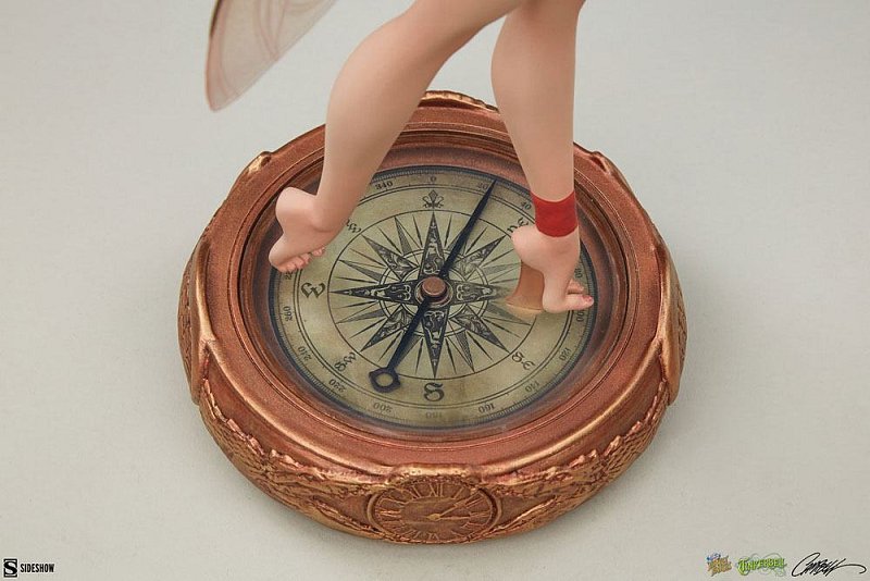 Tinkerbell stands 12\" tall, strutting atop an intricate Neverland compass base that points the way to adventure. Detailed twin crocodiles are carved into the bronze-colored instrument, which has a realistic clear face beneath Tink\'s delicate feet.