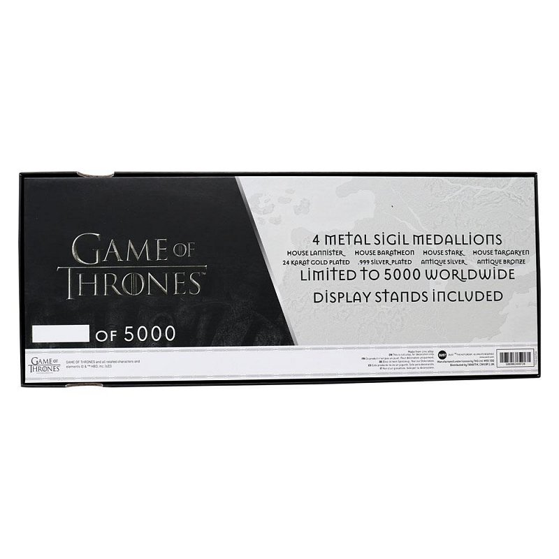 This precious metal premium set by Fanattik features four house crest medallions from Game of Thrones, includes one 24k gold plated and one .999 silver plated piece. Each box is individually numbered and the set is limited to just 5,000 worldwide. Each medallion is heavily embossed and is supplied with an individual display stand.