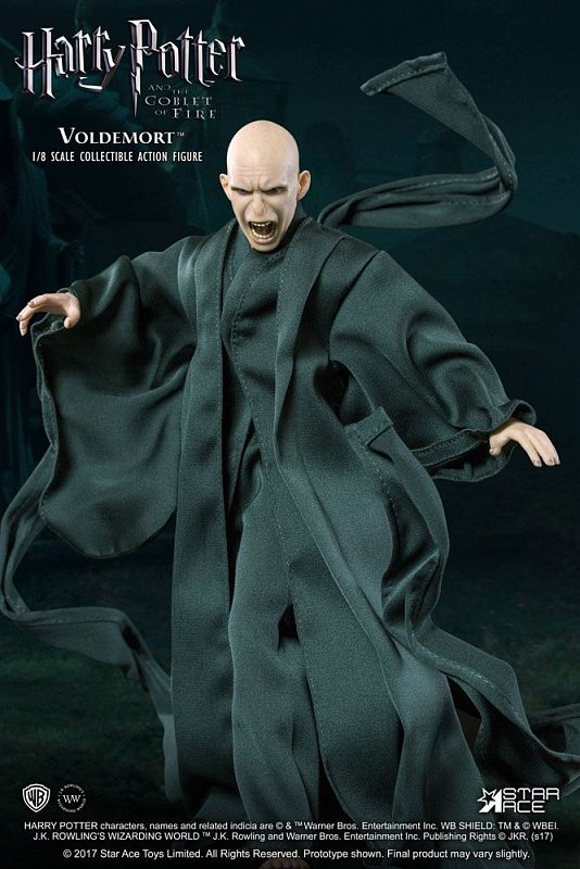 The 1/8th scale Lord Voldemort collectible figure specially features:\n\n-1/8th scale body, approximately 23 cm tall with articulation\n- Fully realized authentic likeness of Lord Voldemort in the movie \"Harry Potter and the Deathly Hallows\" with accurate facial expression and detailed skin texture.\n- Each piece of head sculpt is specially hand-painted.\n\nContent:\n\n- Figure stand\n- One (1) piece of fierce facial expression head\n- Three (3) pieces of interchangeable hands\n\nCostume:\n- One (1) dark wizard robe\n- Three (3) set of magical tendrils\n\nAccessories:\n- One (1) Lord Voldemort\'s wand\n- One (1) Lord Voldemort\'s wand with LED\n- One (1) fire effect\n- One (1) pair of bare feet