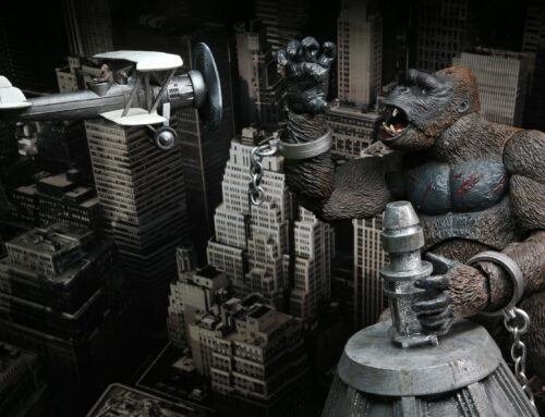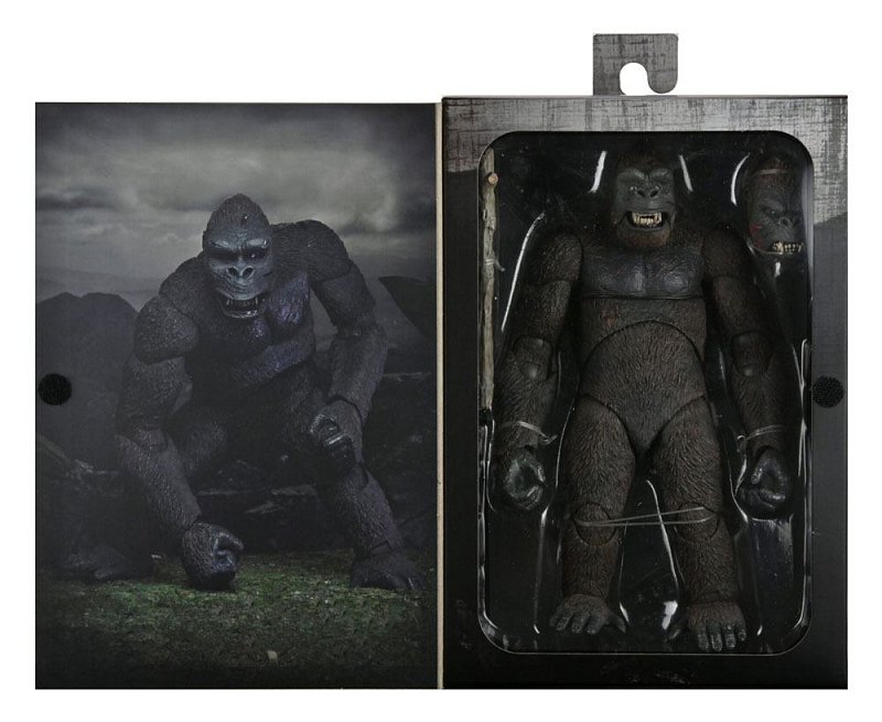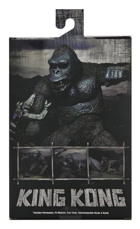 NECA proudly presents the Ultimate King Kong! He stands 8? tall with super detailed hair and battle wounds across the body and head sculpts, received from defending his island. This massive figure has over 30 points of articulation. The figure includes two brand-new interchangeable heads (one with jaw articulation), 3 pairs of interchangeable hands, a pit monster, pteranodon, and tree trunk accessory. Display-friendly window box packaging with opening front flap.