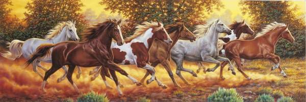 V dnešní době koně patří mezi domestikovaná (ochočená) zvířata. V minulosti se koně používali zejména jako dopravní prostředek. Nyní v jejich sedle trávíme převážně volný čas. Koně jsou pro člověka velmi důležitá zvířata, která mnoha zemědělcům již několik staletí účinně napomáhají. Na obrázku vidíme stádo divokých bezmezně cválajících koní, které barevně téměř splývají s okolní krajinou. Puzzlemi budou nadšeni všichni, zejména také milovníci koní.