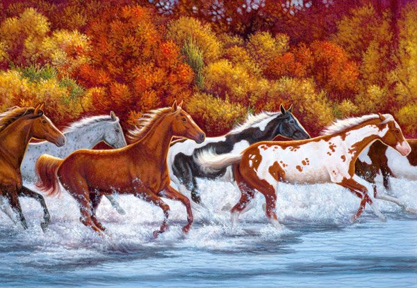 Je-li Vaším oblíbeným zvířetem kůň, pak Vás jistě zaujme puzzle Koně všech Barev, na kterém se stádo koní žene horskou řekou.