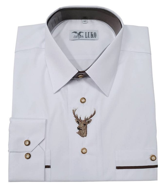 Bílá bavlněná košile s výšivkou jelena, dlouhý rukáv, parohový knoflík.