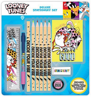 Straight from the ´Looney Tunes´ comes this cool deluxe stationery set. It features a pencil, ruler, sharpener, eraser, pen, 5 colouring pencils and A7 Notepad.
