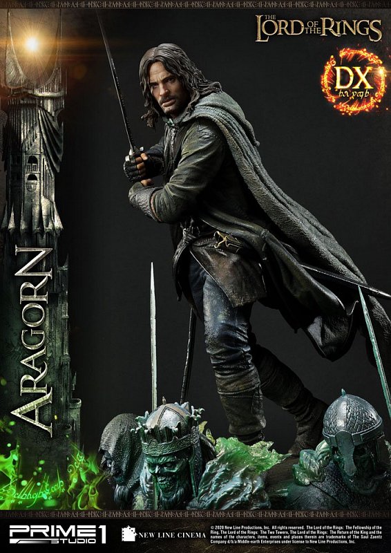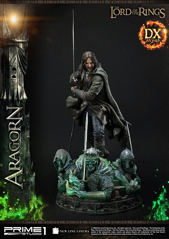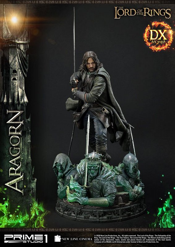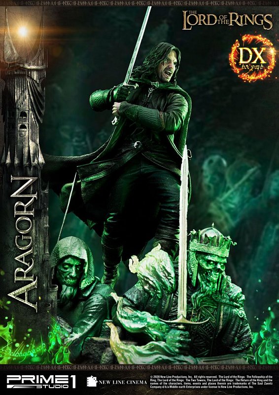 Aragorn and the King of the Dead lead the assault! From top to bottom we have put the upmost attention to detail in this masterpiece. The glorious Evenstar jewel hangs around the neck of the most film accurate Viggo Mortensen likeness on the market. This Deluxe version will feature two (2) extra portraits to display a variety of expressions. Aragorn\'s sword: Andúril has been perfectly crafted and even features the ancient inscription. We have added a translucent resin effect on the Army of The Dead to create the ghostly feel of the army. We have brought all these elements together to bring one of the most breathtaking scenes in the entire The Lord of The Rings Trilogy to your collection! More than a must-have for fans and collectors everywhere!