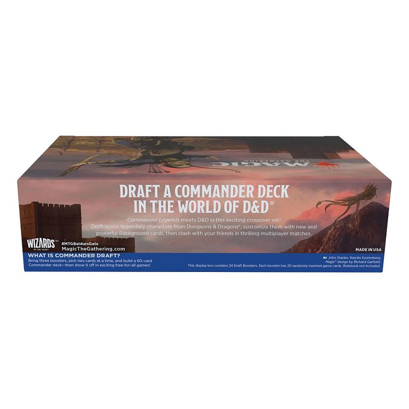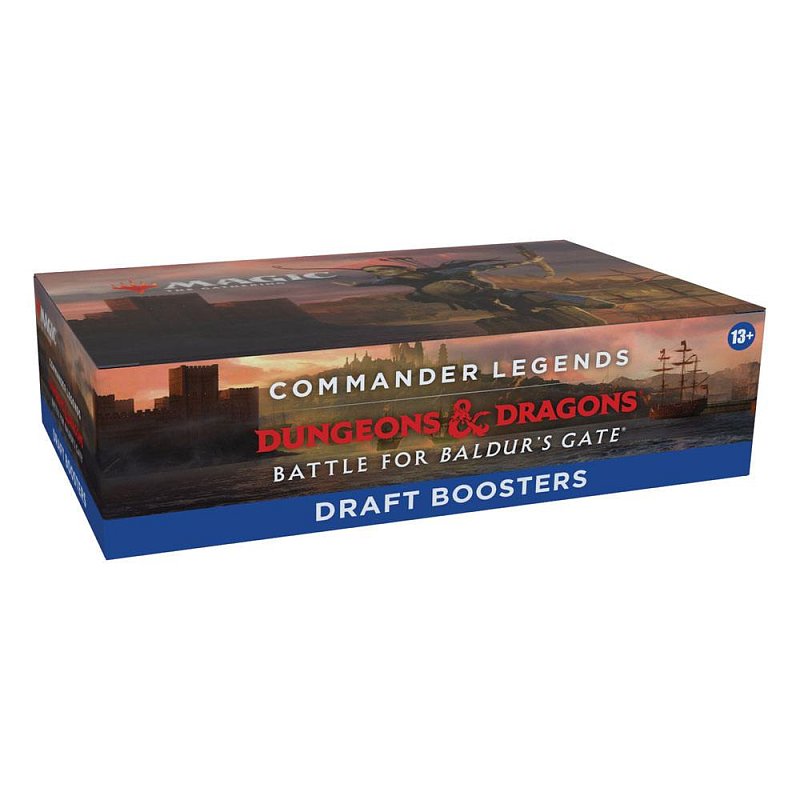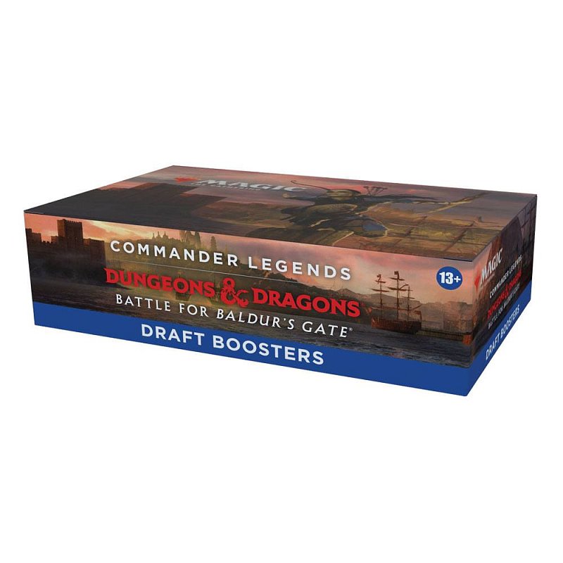Navrhněte balíček velitelů ve světě Dungeons & Dragons. Každý Commander Legends: Battle for Baldur's Gate Draft Booster obsahuje 20 karet magie a 1 token/reklamní kartu s kombinací 1–4 karet rarity Vzácné nebo vyšší (2: 37 %; 3: 6 % ; 4: <1%), 3-6 méně časté a 13-15 běžných karet. 1 karta jakékoli vzácnosti je tradiční fólie. Tradiční Foil Borderless Mythic Planeswalker za méně než 1 % boosterů.