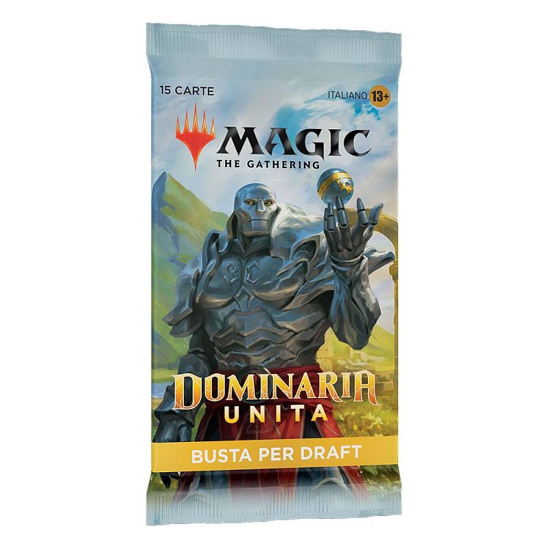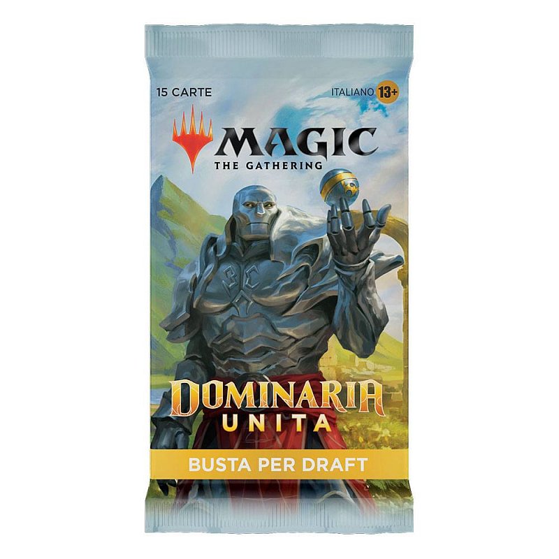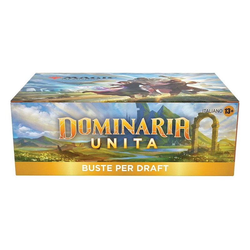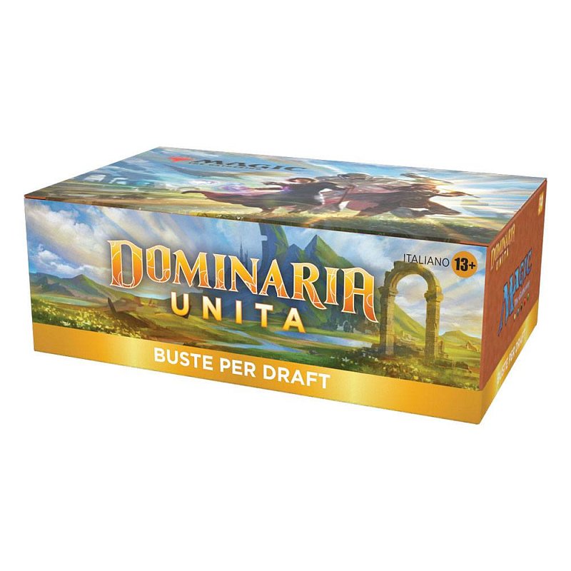 Ein Dominarias Bund Draft-Booster-Display enthält 36 Dominarias Bund Draft-Booster und 1 traditionelle Box-Topper-Foilkarte. Jeder Dominarias Bund Draft-Booster enthält 15 Karten und 1 Spielsteinkarte oder Werbekarte, darunter eine Kombination aus 1 Karte der Seltenheit selten oder höher, 3 nicht ganz so häufigen Karten, 10 häufigen Karten und 1 Länderkarte. Traditioneller sagenhaft seltener Foil-Planeswalker ohne Rand in < 1 % der Booster. In 33 % der Booster ersetzt eine traditionelle Foilkarte zufälliger Seltenheit eine häufige Karte.