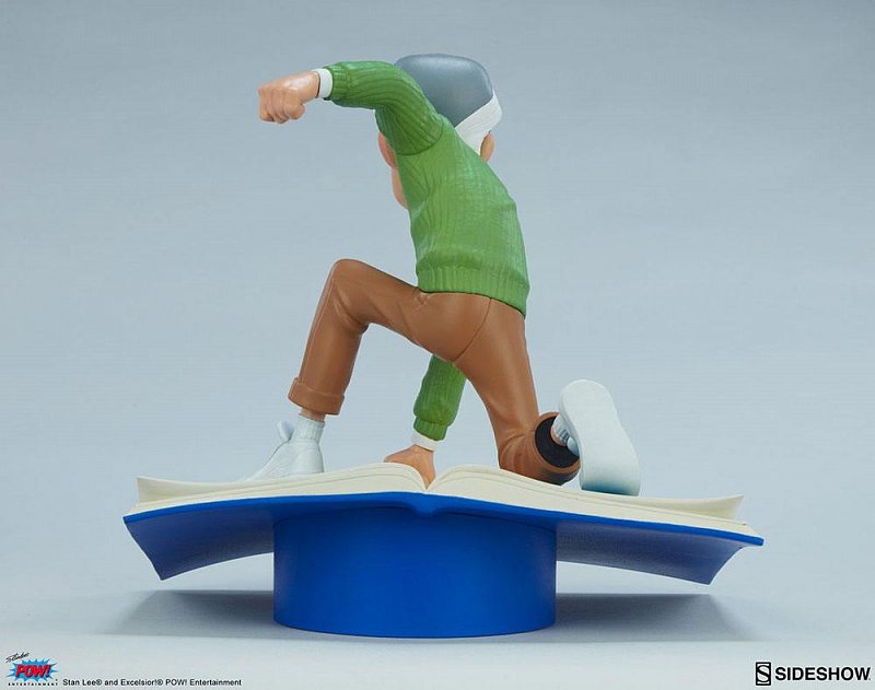 Measuring 9\" tall and 9.4\" wide, this energetic representation of Stan \"The Man\" Lee strikes a super heroic pose, landing a punch with an explosive burst of yellow. Leaping off the pages of a colorful comic book-themed base, the creative visionary is clad in his signature green sweater, tinted shades, and super smile, just as iconic as any hero\'s mask or four-color costume.