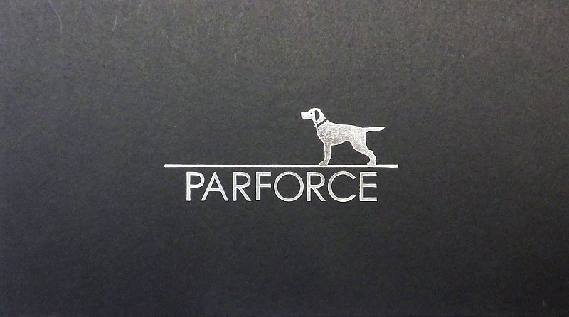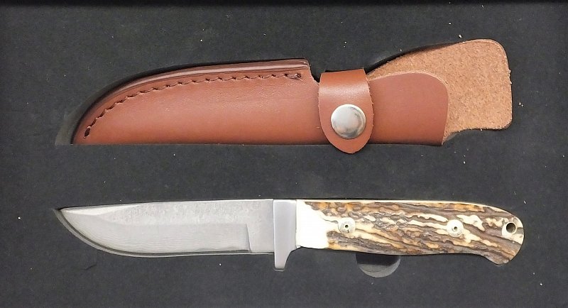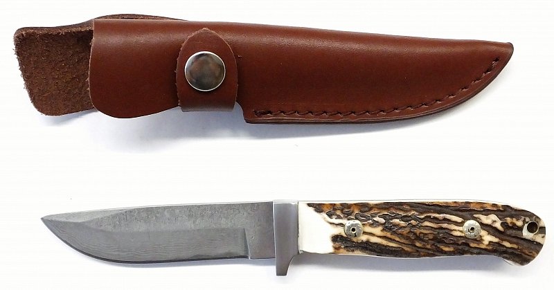 Nůž značky Parforce s damaškovou čepelí a koženým pouzdrem v elegantní dárkové kazetě.