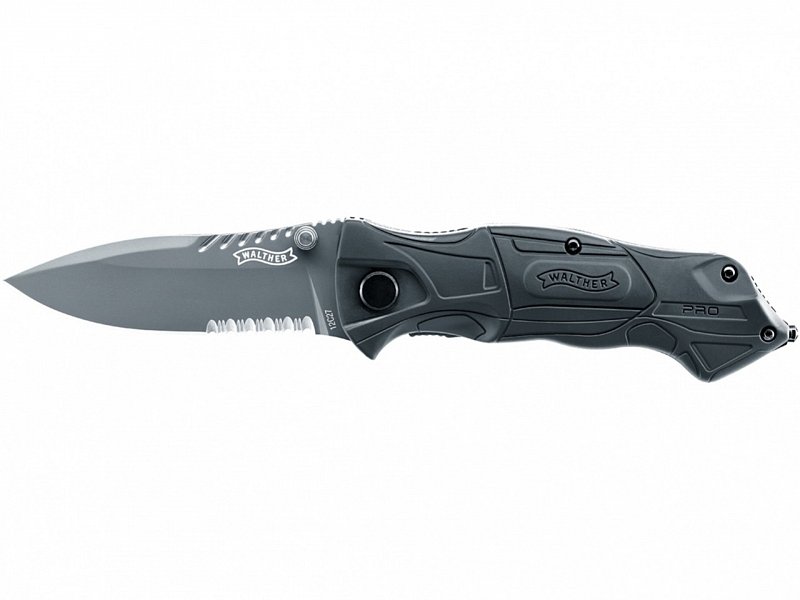 Taktický zavírací nůž firmy Walther s kombinovaným ostřím, hladké, vroubkované a klasickou špičkou clip-point.