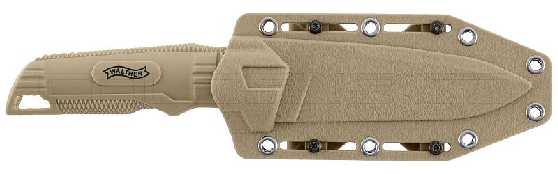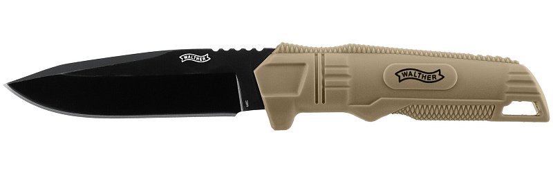 Walther Back-Up Knife, nůž s pevnou čepelí z nerez oceli 440C a černou povrchovou úpravou, hladké ostří, spearpoint špička, odolná polymerová rukojeť s neklouzavou úpravou, plastové pouzdro na opasek.