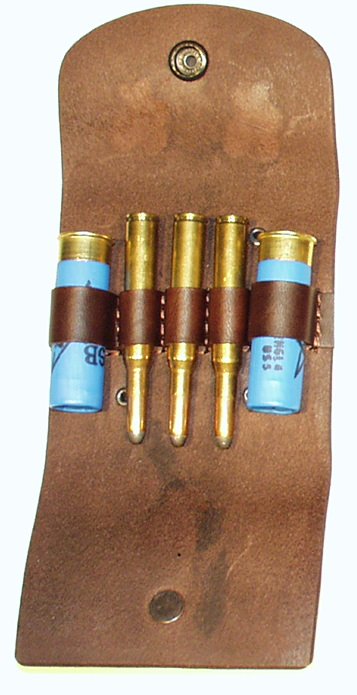 Kožené kombinované pouzdro na 3 kulové a 2 brokové náboje. Pouzdro možno připnout na opasek.