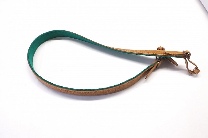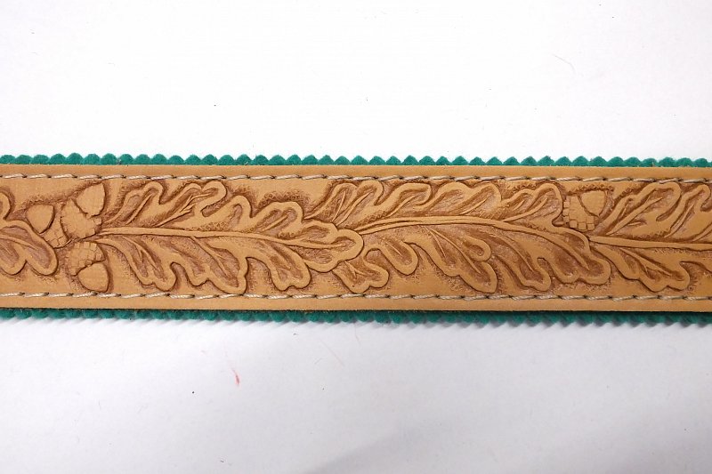 Řemen podšitý zeleným filcem o šířce 3 cm, délka 120 - 130 cm, délku lze volit přezkami