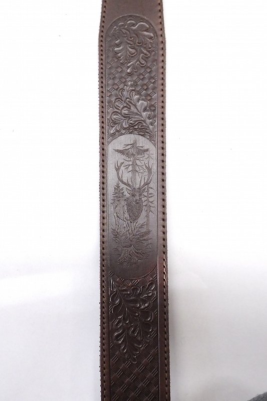 Kožený řemen na pušku podšitý gumou, šířka max 5 cm, délka cca 110 cm