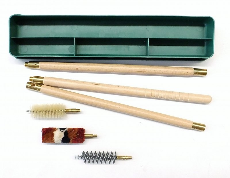 Sada v plastové krabičce obsahuje skládací tyč, kartáček mosaz, kartáček štětina a kartáček lacetka (bavlna).
