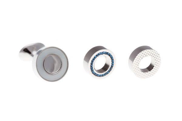 Sada manžetových knoflíčků 3v1 s měnitelným designem v bílé, s modrými krystaly nebo kovovém designu