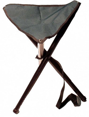 Dřevěná sedací trojnožka, textilní (nylonová) dečka, s nylonovým ramením popruhem, výška 50 cm, nosnost 120 kg