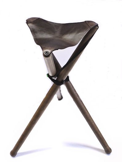 Dřevěná sedací trojnožka, kožená dečka, nylonový ramení popruh, výška cca 75 cm, nosnost 120 kg
