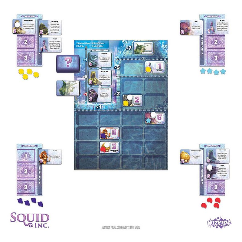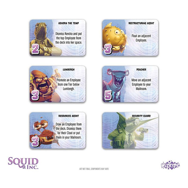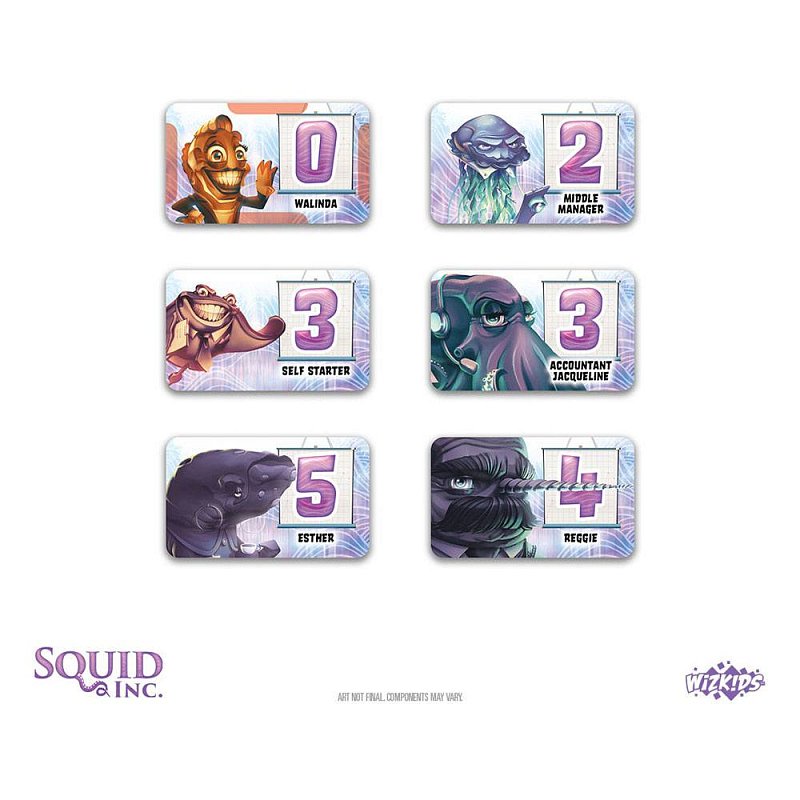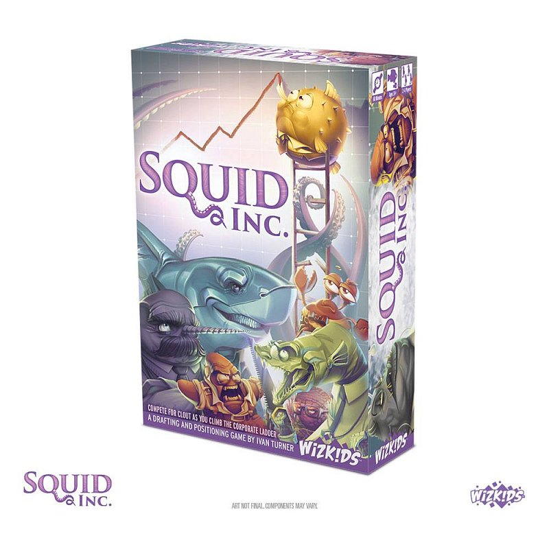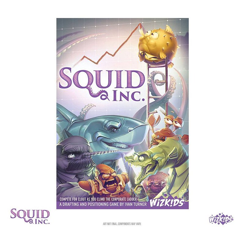 In Squid Inc., designed by Ivan Turner, and featuring art by Matijos Gebreselassie, you play a lowly guppy looking to become the company\'s big fish by influencing employees at every level, and guiding them up the corporate ladder, no matter who ends up in your wake!