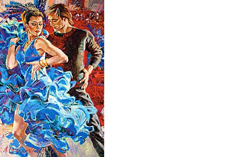 Z obrázku vyzařuje zaujetí muže i ženy vášnivým, pravděpodobně svižným španělským tancem. Jasně modrá sukně tanečnice se vlní v divokém emotivním projevu. Ten je znát i na rukou obou tanečníků, když jejich roztažené prsty zdůrazňují náruživost a zanícenost tancem. Hluboké prožívání rytmu hudby se promítá i do jejich tváří. Oči jsou skloněné a tváře zároveň napjaté i uvolněné společnou harmonií a energií, které jim tanec přináší. V synchronizovaných pohybech se stávají přirozenými a spontánními. Jejich taneční figura ukazuje vzájemné propojení, originalitu i romantiku projevu. Tančete pro radost, pro cit a krásu souznění splynutí s hudbou.