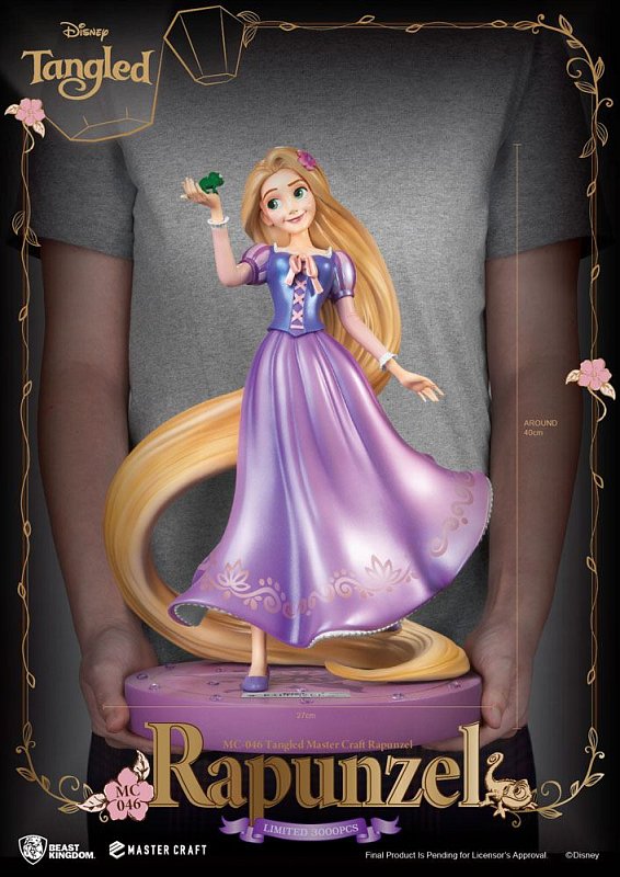 Beast Kingdom is proud to present a new Master Craft princess series statue that captures the energetic charm of Rapunzel from the beloved film \"Tangled.\" The statue presents Rapunzel\'s golden hair and elegant purple dress, showcasing her lively and active personality on a dedicated platform. The base is designed with purple flower pieces and pink-purple swarovski elements crystal. Far from the image of a weak princess, Rapunzel shows her adventurous and freedom loving personality. You\'ll love it!