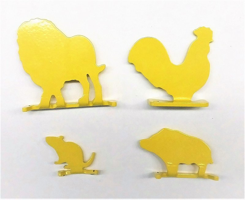 Raven Animal 4, sada čtyř kovových zvířátek žluté barvy, použitelné jako cíle pro střelbu, vyrobeno z kovu o tloušťce 3mm, testováno pro střelivo diabolo a steel BB z pistolí i dlouhých pušek.