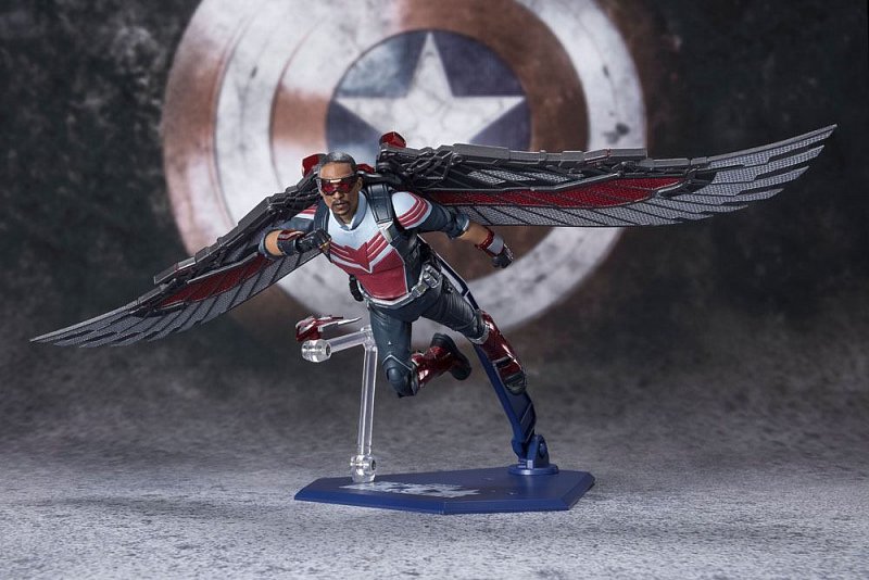 The Falcon, from \"The Falcon and the Winter Soldier,\" streaming on Disney+ starting in March, joins S.H.Figuarts in his new costume! Tamashii digital coloring technology replicates his face with faithful accuracy, and his distinctive wings stretch an impressive 320mm in span, allowing for dynamic action poses. Includes accessories such as custom stand printed with a logo.