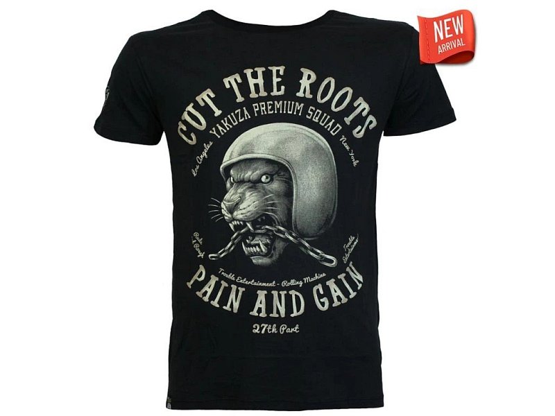 Hlavní motiv na hrudi představuje pantera v retro helmě s řetězem v zubech, doplněný o nápisy CUT THE ROOTS a PAIN AND GAIN, které odkazují na sílu, bojového ducha a život bez kompromisů. Nechybí ani detaily jako Yakuza Premium Squad – Los Angeles – Part 27th. Zadní část trička zdobí velký text PAIN AND GAIN, který posiluje charakter celé kolekce.