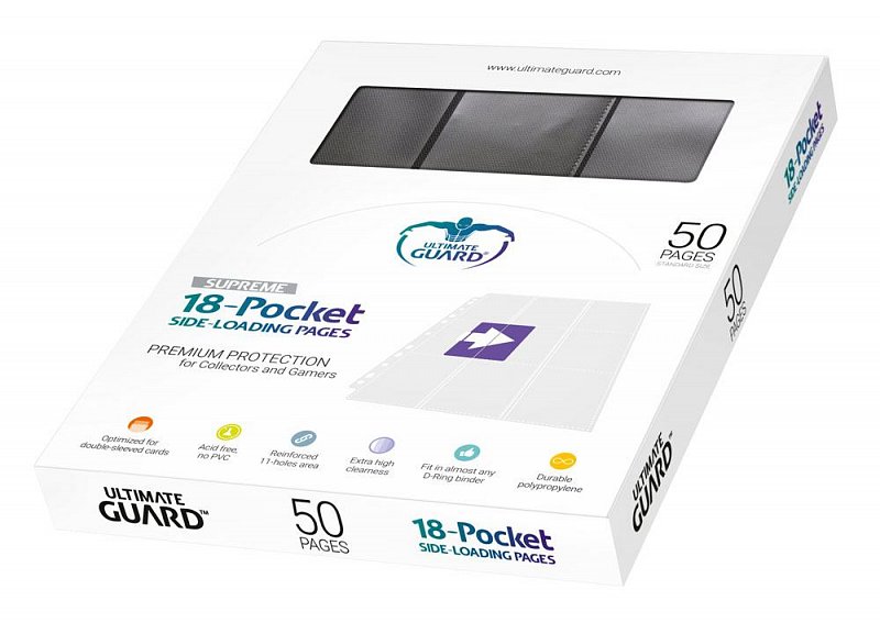 High-quality, double-sided pocket pages (18 pockets, 9 pockets each on front and back side), that fit in almost any D-Ring-Binder, thanks to the double reinforced 11-hole strip. Each pack contains 50 pages for storing and carrying at least 900 double-sleeved cards (18 per page).\n\n- Side-loading Design\n- Double reinforced 11-hole strip\n- Extra durable base material with semi-transparent middle layer \n- 50 pages holding at least 900 double-sleeved cards\n- 9-Pocket Pages with double page design\n- Fit in almost any D-Ring Binder\n- Extra high clearness of the protective foil\n- Acid free, no PVC\n- Page size: approx. 237 x 290 mm\n- Packaged in attractive counter-top display\n\nIdeal for the Ultimate Guard Supreme Collector Album XenoSkin.