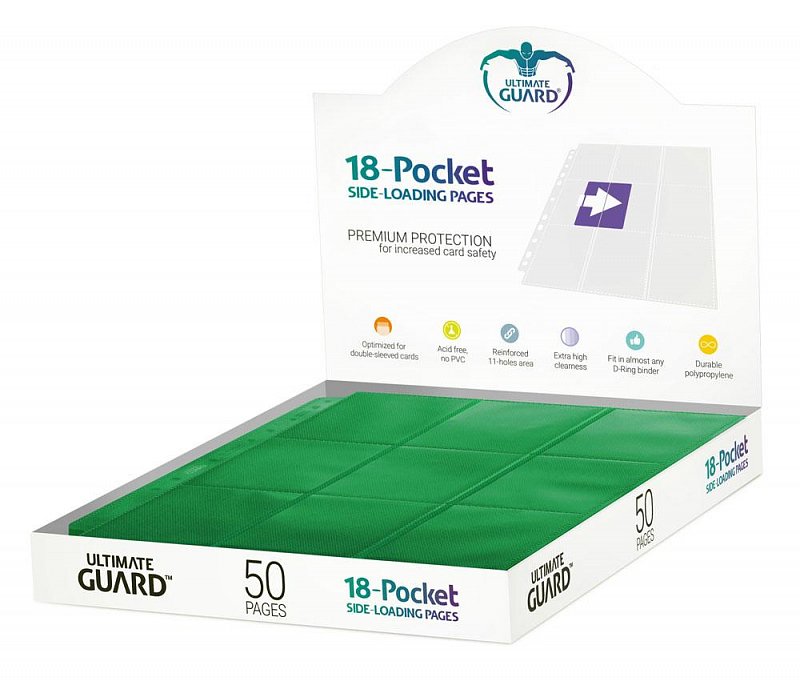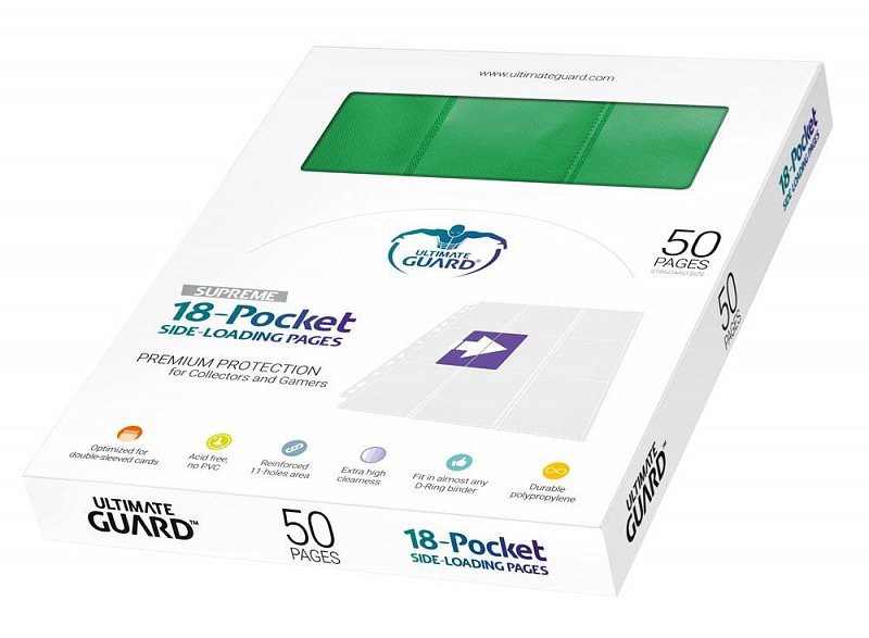 High-quality, double-sided pocket pages (18 pockets, 9 pockets each on front and back side), that fit in almost any D-Ring-Binder, thanks to the double reinforced 11-hole strip. Each pack contains 50 pages for storing and carrying at least 900 double-sleeved cards (18 per page).\n\n- Side-loading Design\n- Double reinforced 11-hole strip\n- Extra durable base material with semi-transparent middle layer \n- 50 pages holding at least 900 double-sleeved cards\n- 9-Pocket Pages with double page design\n- Fit in almost any D-Ring Binder\n- Extra high clearness of the protective foil\n- Acid free, no PVC\n- Page size: approx. 237 x 290 mm\n- Packaged in attractive counter-top display\n\nIdeal for the Ultimate Guard Supreme Collector Album XenoSkin.