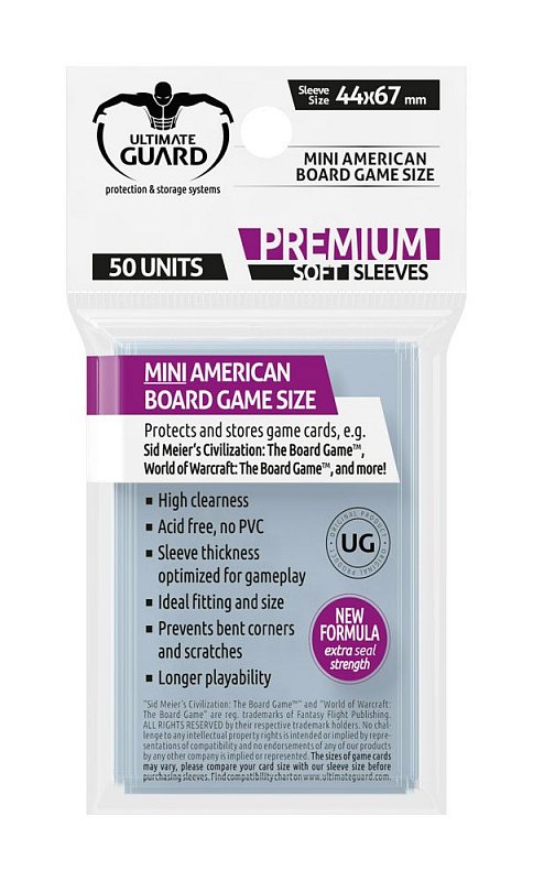 This pack contains 50 high quality sleeves for small-sized American board game cards used in games like Sid Meier‘s Civilization: The Board Game™, World of Warcraft: The Board Game™, and more.