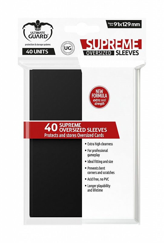 The supreme way to protect your oversized gaming cards, like Magic the Gathering(TM) Commander and others. 40 high-quality sleeves per pack.\n\n- Extra high clearness\n- For professional gameplay \n- Longer playability and lifetime\n- Prevents bent corners and scratches\n- Acid free / No PVC\n- Ideal fitting and size\n- Sleeve size: 91 x 129 mm