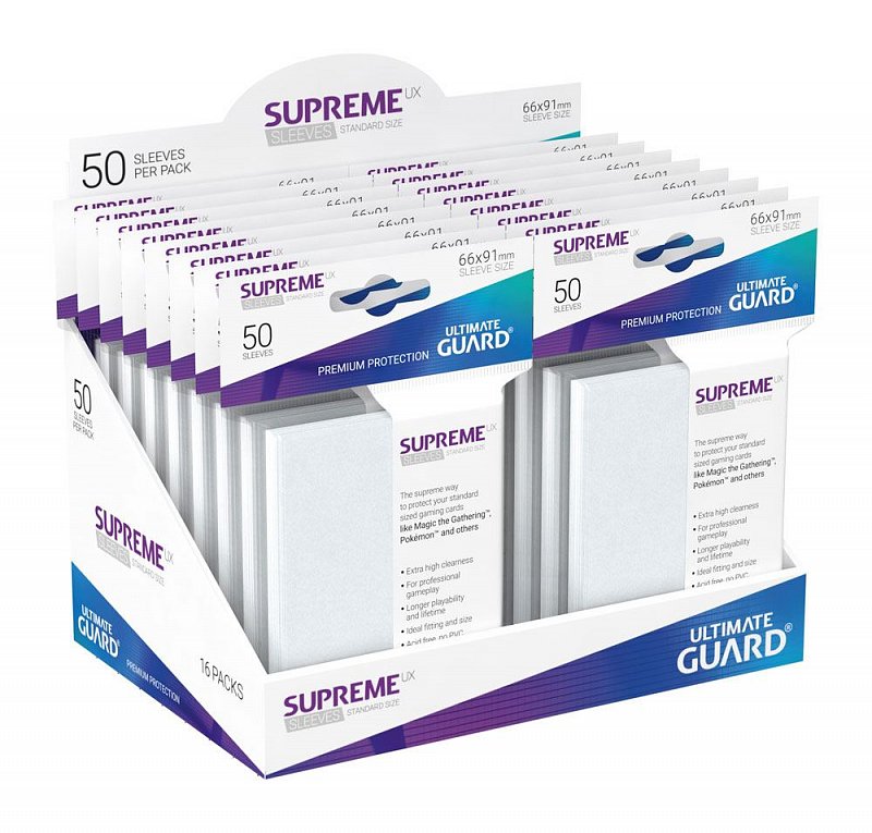 This pack contains 50 high quality card sleeves for all standard sized gaming cards, like Magic the Gathering™, Pokemon™ and others.\r\n\r\nWhen buying 16 packs, they will be shipped in a high quality cardboard counter display.\r\n\r\n- New formula: Extra seal strength\r\n- Extra high clearness\r\n- Acid free, no PVC\r\n- For professional gameplay\r\n- Ideal fitting and size for a perfect hold\r\n- Prevents bent corners and scratches\r\n- Prolongs the playability and lifetime of cards\r\n- Size of sleeves: 66 x 91 mm