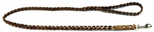 Vodítko z pletené kůže, hnědé provedení, šířka 2 cm, délka 130 cm, ukončeno karabinou.