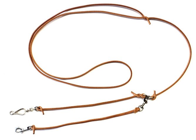 Vypouštěcí vodítko na 2 psy z kulaté přírodní kůže, klešťové karabiny