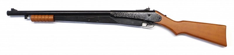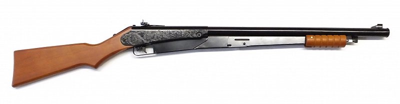 Dětská vzduchovka evokující klasickou pumpu. Nabijení se provádí pohybem předpažbí. Zásobník na 50 ks ocelových BB broků 4,5mm.