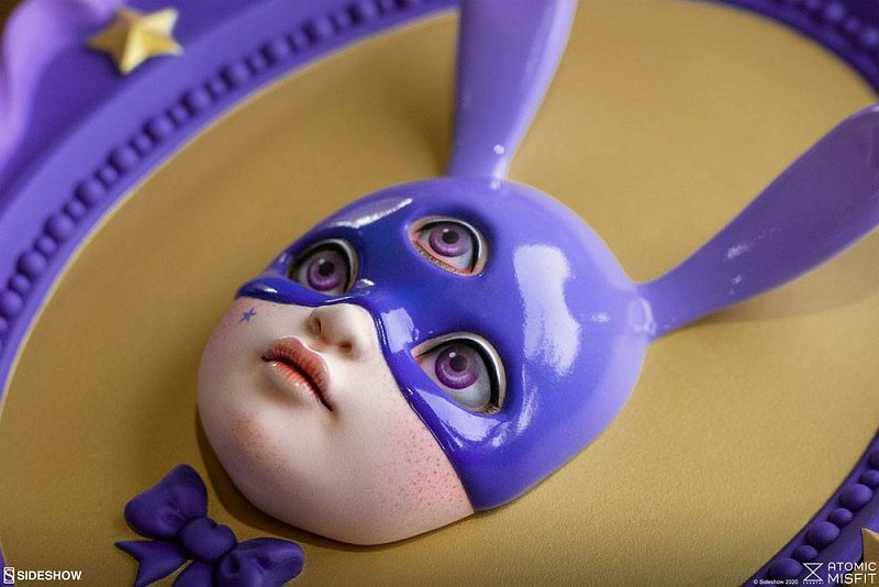 This dreamy sculpted cameo is framed by purple swirls and golden stars, as the beautifully detailed \"Bun\" doll face gazes forward with enlightened perception. What is she thinking? Only you can interpret the meaning behind her expression. The portrait is gently dusted with freckles, a star-shaped beauty mark, and perfectly pouting lips, and finished off with a darling purple bow.